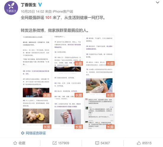 在这篇文章中,丁香医生将那些曾经攻占家族群的健康类谣言“一网打尽”,针对101条谣言,给出一一反击。最终,这篇文章在微博上收获近16万次转发,并被《人民日报》公众号转载。