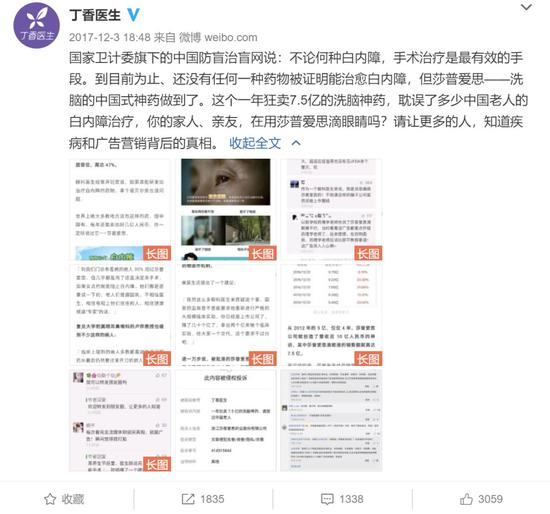 去年12月3日,丁香医生的一篇文章《一年狂卖7.5亿的洗脑神药,请放过中国老人》称,多位眼科医生不认可莎普爱思滴眼液的“白内障防治功效”:“不论何种白内障,手术治疗是最有效的手段。到目前为止、还没有任何一种药物被证明能治愈白内障,但莎普爱思——洗脑的中国式神药做到了。”↓↓