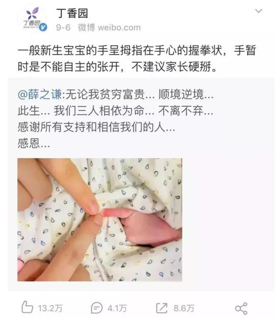 薛之谦生娃,发布一家三口手指照,丁香医生批评说:“不要硬掰婴儿手指。”↓↓
