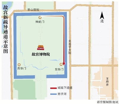 此前,故宫游客从北门神武门出宫后,前往王府井地区最便捷的路线是从景山前街至北池子大街,到达故宫东华门,再从东华门大街直行到达王府井。