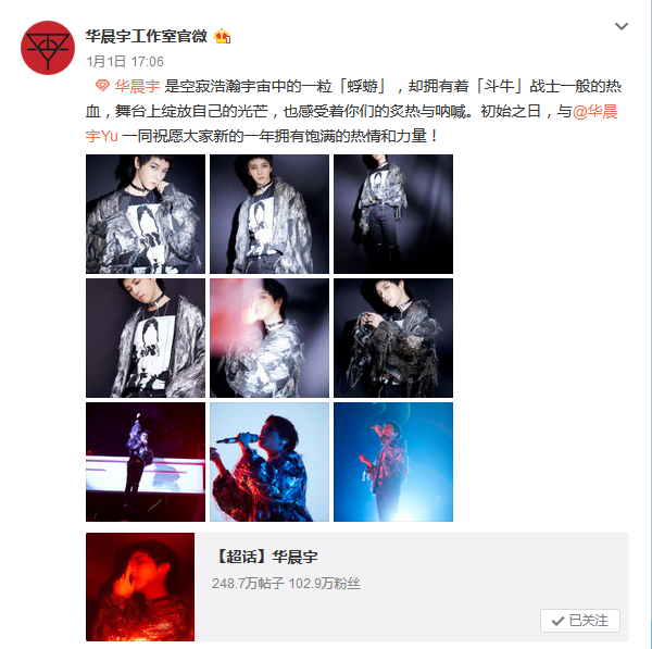 新京报讯 (记者 杨畅)2019年1月1日零点,“华晨宇工作室官微”正式发表第一篇微博,内容为华晨宇祝大家新年快乐。1月2日,有网友爆料华晨宇换了新的经纪人,并晒出疑似其朋友圈截图:“新年第一天,我正式成为火星村民”。