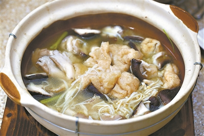 289创意园的炭烧老味的“鱼腐肉丸杂菇煲”同样清丽。罗定鱼腐用新鲜鲮鱼肉制成,厨师将炸好的鱼腐放进高汤里,金针菇、袖珍菇等吸收了鱼腐的油脂香,吃完全身暖暖的。