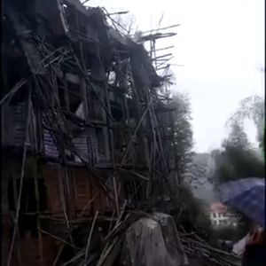 事发现场视频显示,在一在建的砖石结构建筑外侧,搭建的竹脚手架大面积脱落,散落的脚手架堆积在旁边道路上。