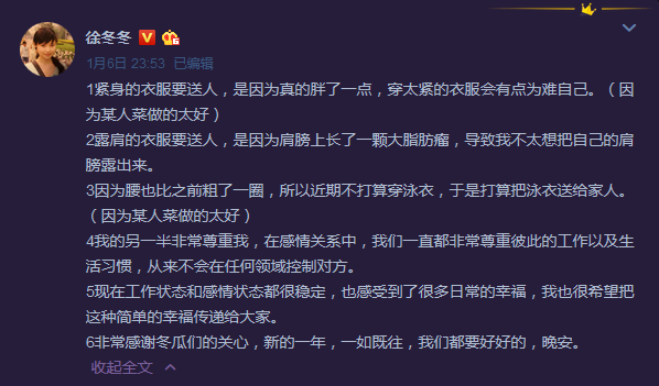 自从在微博公布恋情之后,徐冬冬经常在微博秀恩爱,最近她拿出之前的很多衣服准备送人,“因为某人菜做的太好吃,腰比之前粗了一圈”。她还表示目前工作状态和感情状态都很稳定,也感受到了很多日常的幸福,“我的另一半非常尊重我,在感情关系中,我们一直都非常尊重彼此的工作以及生活习惯,从来不会在任何领域控制对方。”