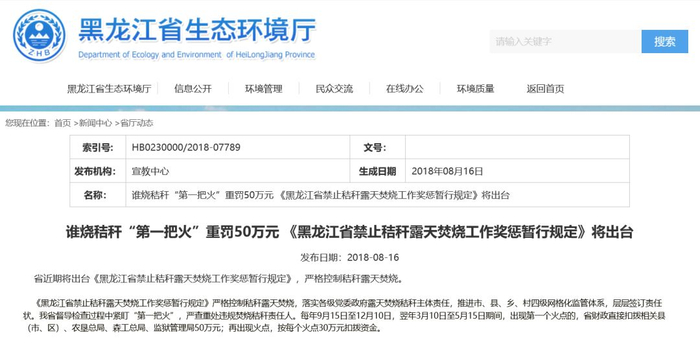 2018年8月16日,黑龙江省生态环境厅官网发布消息:省近期将出台《黑龙江省禁止秸秆露天焚烧工作奖惩暂行规定》,严格控制秸秆露天焚烧。