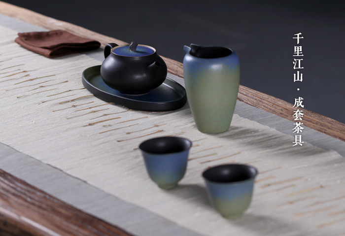 《千里江山图》现藏于故宫博物院,是画家王希孟的作品,也是“中国十大传世名画”之一。而千里江山茶具套装就用了此画的颜色,青绿之间又有赭色。在用餐前或用餐后,摆出一套茶具,以茶会友。