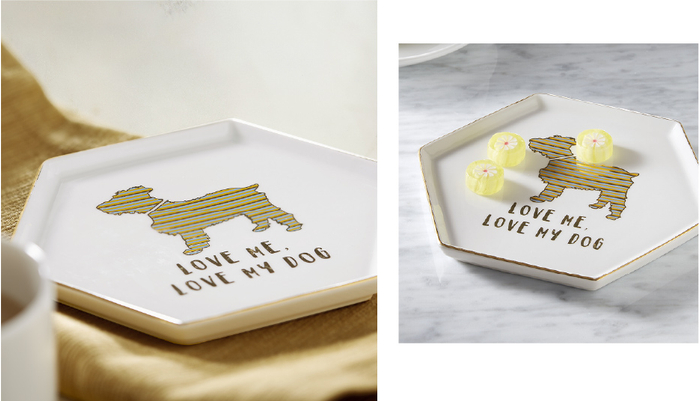 六边形的盘子简约又不失个性,盘内小狗的动物形象和英文字母都是由金花纸制成,既有精湛工艺又有趣味性。