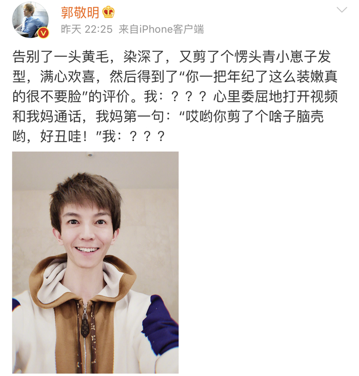起因是他之前在微博晒出自拍照,并发文表示自己将发色染深了,又剪了个“愣头青”的发型,却得到“一把年纪还装嫩”的评价。心里委屈的他打开视频和妈妈通话,结果妈妈的第一句却是“哎呦你剪了个啥子脑壳呦,好丑哇”。