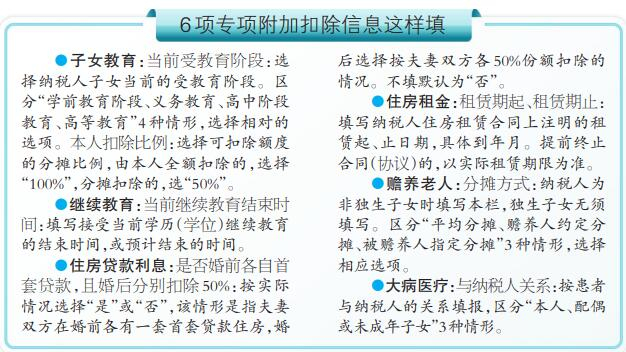 据介绍,纳税人填写专项附加扣除信息归纳起来,就是3步:对条件、报信息、留资料。填写内容之前先将自己的个人情况与6项专项附加扣除的条件对照一下,看自己是否符合扣除的条件,比如子女是否处于受教育阶段,老人是否已达到60岁等。随后可报送相关信息,最后将填写信息的资料自行留存,例如多子女赡养父母的协商协议,协议由子女自行保存,后期如果发生纠纷按照事先签署的协议为主。