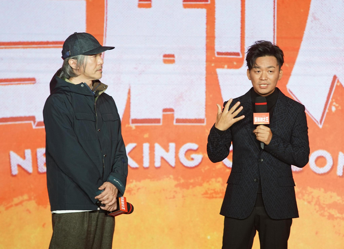 导演周星驰与主演王宝强谈龙套经历。新京报记者 郭延冰 摄