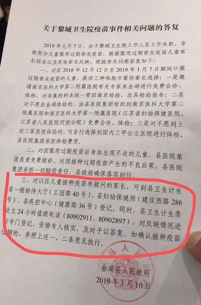 当地官方介入调查后表示已确定全县有145名儿童接种了过期疫苗,并发布通报说此事系“管理混乱,工作失职,监管失灵”所引发,已经将涉事卫生院的负责人和相关当事人、县疾控中心领导班子成员和相关科室人员“全部停职”,并会承担此次“疫苗过期”问题的一切后果。