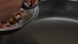 冬菇、腊肉、腊肠等配料需要先切成丁,倒入平底锅中煸香。