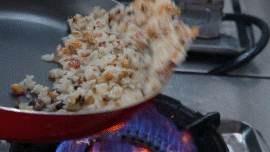 重复上述步骤四到五遍后,糯米饭便快要完成了。这时再倒入已炒熟的配料,加上少许水和调料,炒到糯米呈现出色泽金黄、晶莹通透、粒粒分明的感觉时,便可以盛出!
