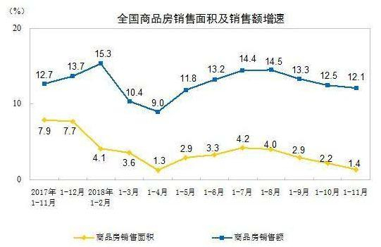 从全国销售额和销售面积来看,近几个月,销售额和销售面积增速持续下滑。1-11月份,商品房销售额12.95万亿元,同比增长12.1%;销售面积14.86亿平方米,同比增长1.4%,比上个月有所下滑。