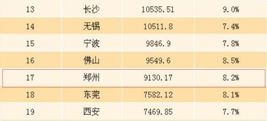 截至2017年,全国共有14座城市GDP突破万亿,排在第15-17位的宁波、佛山、郑州则距离万亿大关只有一步之遥。而在郑州身后,“追兵”西安、大连、东莞还有较大的差距。