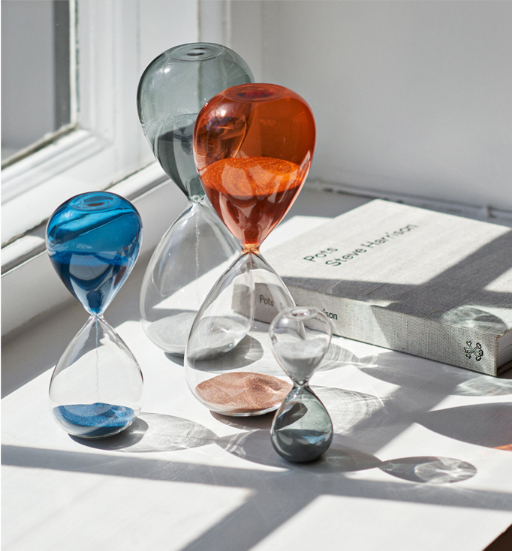 此外,当阳光透过大大的玻璃窗铺洒满室时,桌上的玻璃沙漏摆件就显得格外亮眼。