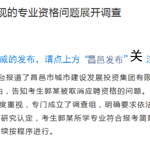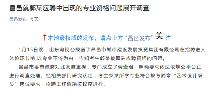 据人民网-山东频道消息 1月17日,山东省昌邑市委市政府对考生小郭被取消应聘资格的问题作出回应,市委市政府对此高度重视,专门成立了调查组,明确要求依法依规公平公正进行调查处理。经相关部门研究认定,考生郭某所学专业符合报考简章“艺术设计职员”岗位要求,招聘工作继续按程序进行。