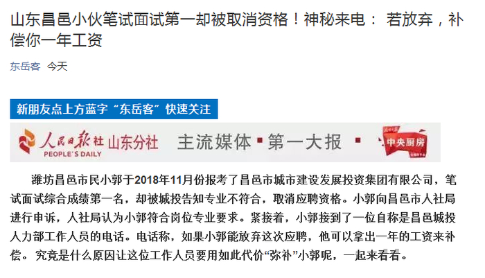 山东一小伙笔试面试第一却被取消资格 官方回应