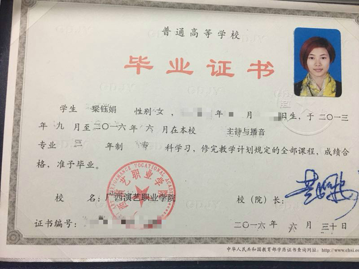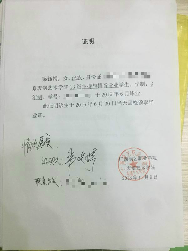 这让梁钰娟感到荒唐。她告诉新京报记者,她从来没有去过河南。而且,2016年6月30日,是她领取毕业证的日子。那天一早,她就来到学校——广西演艺职业学院,直到下午四五点才和同学回到自己的住处。“当天晚上,几个同学在我家里吃的晚饭,我根本没有时间去河南。”