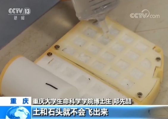 重庆大学生命科学学院博士生 郑先喆:找一个水溶棉,把它盖在种子上面,盖紧以后在振动的过程当中,土和石头就不会飞出来,就达到一个很好的固定效果,而且水溶棉遇水就会溶化,当我们在注水以后,水把水溶棉溶化以后,就可以空出来。植物也会吸水,然后开始生长。
