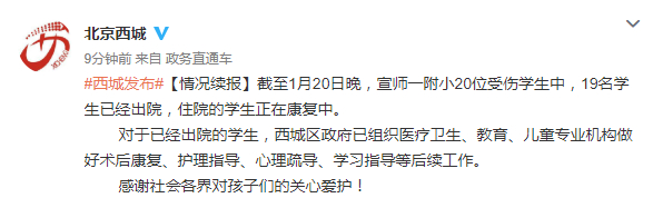 新京报快讯  据北京市西城区人民政府新闻办公室官方微博消息,截至1月20日晚,宣师一附小20位受伤学生中,19名学生已经出院,住院的学生正在康复中。