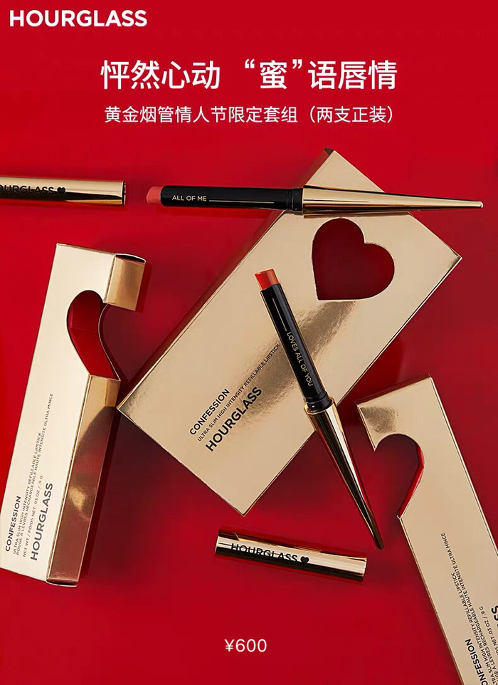 Hourglass推出的情人节限定“烟管口红”套装里包含了两支正装,取“两心相遇,一如你我”的寓意,半颗爱心的烟管包装,相遇拼凑出爱你的形状。内含蜜桃粉和浓情红玫瑰色两款限定色。Hourglass邀你在这个情人节,说出你的“唇情告白”。