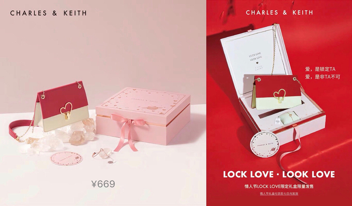 CHARLES & KEITH将在1月23日19:00,开启“情人节LOCK LOVE限定礼盒”的预售。“爱,是锁定TA;爱,是非TA不可。”此次,礼盒里面包含了一只心形锁扣装饰的单肩包。包包采用红白两色相间设计,金色镂空手绘式爱心将浓烈的红色与低调静谧的纯白色无暇连接。爱心手链则采用施华洛世奇元素,通体玫瑰金色,以粉钻镶嵌,非常精致。