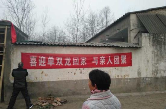 村里的墙上挂着横幅“喜迎单双龙回家,与亲人团聚”,家门口挂上了大红花,贴上了喜字,母亲梁春燕手捧花束早早地出门等待,街道上被热情的乡亲们围得水泄不通。双龙颤抖着喊出妈妈,梁春燕抱着他,泣不成声,两鬓斑白的父亲也流下了眼泪。一家人终于团聚,他们站在大门口拍下了全家福。