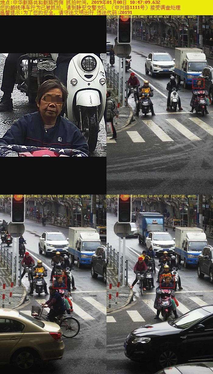 这一辆驶出停车线的电动自行车触发路口抓拍非机动车越线停车的电子警察,电子警察自动从视频中截取出三张图片,记录下蓝衣女子从进入拍摄范围到驶出画面的过程,并截取了一张女子的清晰正脸图。