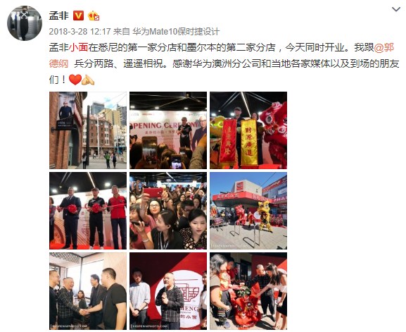 此外,这两年,中餐出海一直是比较热门的话题,全聚德、大董、小肥羊等均在海外开设了门店。在孟非的微博上,新京报记者注意到,2017年5月,孟非称其和郭德纲的第一家“孟非的小面”落户澳大利亚墨尔本。2018年3月,孟非在微博上发布消息称,“孟非的小面”在澳大利亚悉尼的第一家分店和墨尔本的第二家分店同时开业。