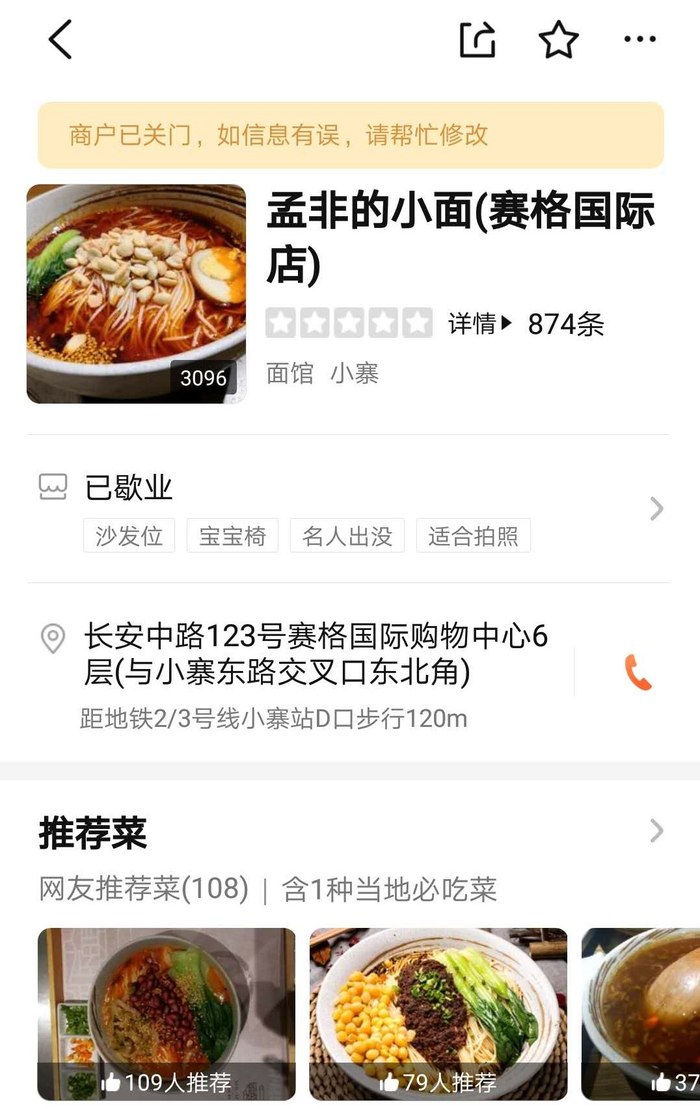 1月22日,新京报记者在大众点评上查询发现,目前“孟非的小面”西安赛格国际店确实处于歇业状态,最近一条网友点评的时间为2018年10月。随后,就该门店歇业的原因,“孟非的小面”招商负责人周先生对新京报记者表示,主要是由于与赛格国际的租赁合同到期,目前正在进行新的门店选址。但具体的选址进展和门店的开业时间,上述周姓负责人并未透露。