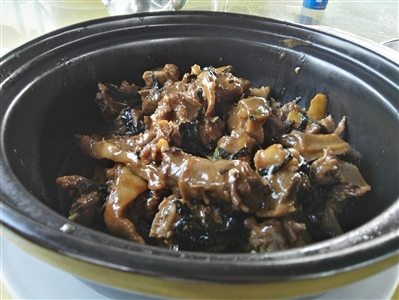 桃李园餐厅是温泉镇路边的一家老饭馆,店面不大,仅有五六张餐桌,店主一家前前后后忙着张罗生意,这家店主要依靠口碑吸引回头客。店里的老板将土鸡斩成块,放入锅中,再加入食用油、调味料和沙姜片,慢火加热将其逐渐焗熟,逼出肉中的鸡油,如是锅底不粘不糊。出锅前,另加放一把香菜,使菜品的香气更加浓郁。这样高温焗出来的鸡肉皮色金黄、香软爽嫩,而且骨肉易离。满满的一煲鲜美鸡肉摆在眼前,很容易让人满足。