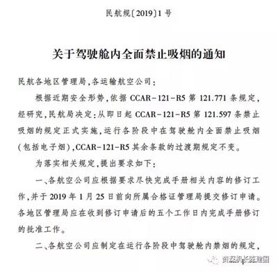 去年发生的某航企因机组吸烟引发的不安全事件引起各方关注。民航局今日(1月19日)发文《关于驾驶舱内全面禁止吸烟的通知》,要求2019年1月25日前向所属合格管理局提交修订申请,制定驾驶舱内禁烟的规定。