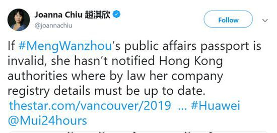 于是,《星报》方面一直负责主导孟晚舟这一护照报道的负责人赵淇欣(加拿大华裔),便据此认定如果孟晚舟的护照真到期了,而她没有通知香港方面更新,那她就是违法。