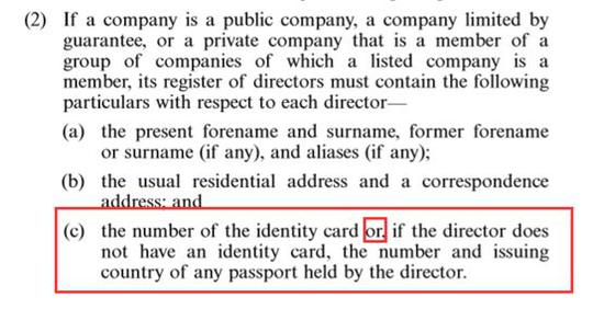 首先,耿直哥查阅了香港的公司法(Company Bill),发现该法律规定只有在公司董事没有香港的身份证号的情况下,才需要给出海外护照的信息。