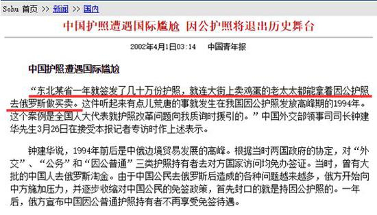 《中国青年报》在2002年时刊发的一篇名为《中国护照遭遇国际尴尬 因公护照将退出历史舞台》的报道也指出,当时中国的“公务普通护照”,因为“免签国家”要比普通护照多,同时护照的管辖缺乏标准,导致“东北某省一年就签发了几十万份护照,就连大街上卖鸡蛋的老太太都能拿着因公护照去俄罗斯做买卖”。