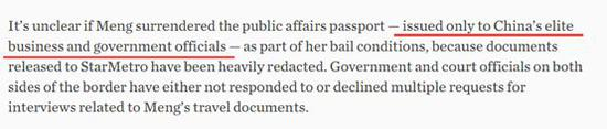 ▲图为加拿大《星报》炒作孟晚舟的“公务护照”,并宣称这本只对“精英”开放的护照证明她和华为公司与中国政府关系“很深”