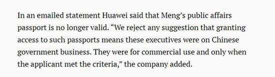 华为公司也在之后给一家同样报道了此事的美国媒体发去的声明中表示,孟晚舟这个2004年的“公务普通护照”早已到期。华为方面还表示他们拒绝一切因为孟晚舟曾持有这个护照,就宣称她是在给中国政府干活的说法。