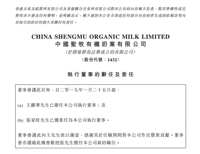 早在1月16日,王跃华就因其他工作安排辞任公司代理财务总监,同时中国圣牧董事长邵根伙辞任代理首席执行官,张家旺正式出任首席执行官,财务总监一职则暂时空缺。
