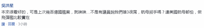 她说这并不合理,认为这笔钱应该由“台船”自己出。而且她也说,造潜舰应该一步一步来,而非滥花民众血汗钱,“怎么细部设计图还没出来,就要编钱盖造船厂?”当时也有岛内网友对“潜舰自造”的预算讽刺称,这只是开始,“后面几千亿的大洞,无数的利益”。