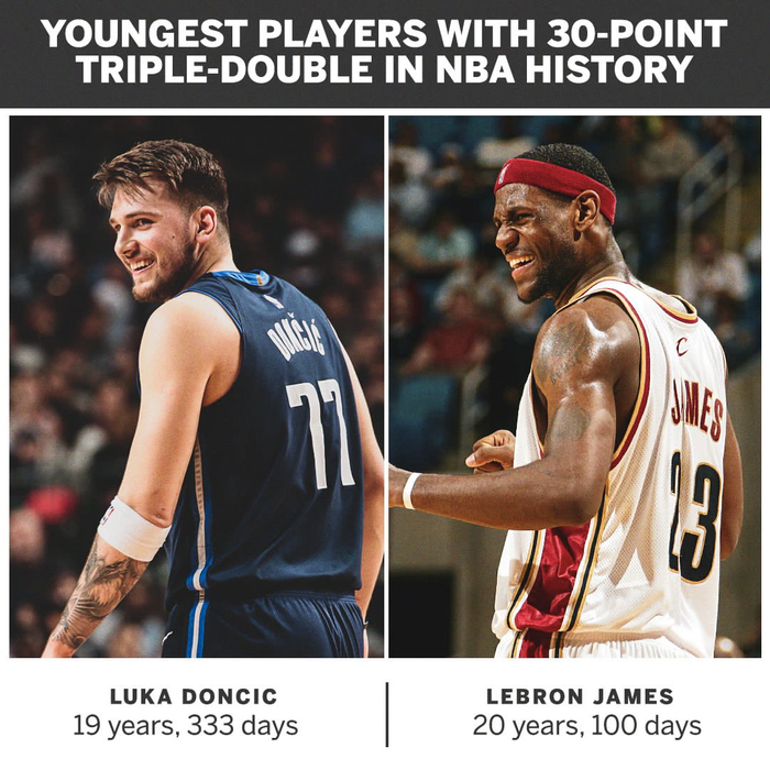东契奇超越詹姆斯成为拿下30+三双最年轻的球员。图/社交媒体
