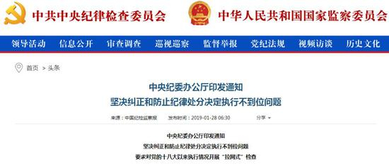 1月28日,中央纪委国家监委网站发布,中央纪委办公厅近日印发《关于坚决纠正和防止纪律处分决定执行不到位问题的通知》(以下简称《通知》),要求各级纪检监察机关(机构)充分发挥统筹协调作用,会同组织部门、受处分人所在单位等,采取自查自纠、交叉检查、随机抽查等方式,对党的十八大以来办结案件的党纪政务处分决定执行情况开展一次全方位“拉网式”检查。