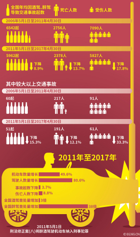 另一组数据则显示,醉驾入刑后至2017年4月底,全国年均因酒驾、醉驾导致的交通事故数量,造成人员死亡和受伤数量,较醉驾入刑前的5年分别下降了8.9%,13.7%和17.8%。