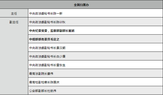 最新的“扫黑办”的副主任,共有4位中央政法委副秘书长,以及最高法副院长,最高检副检察长,公安部副部长,中央纪委常委、监察部副部长,中组部部务委员。