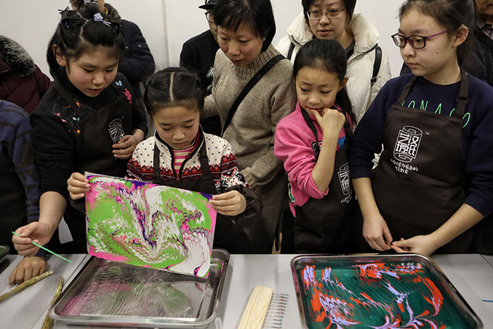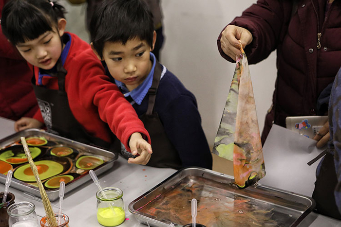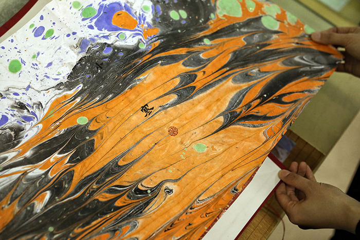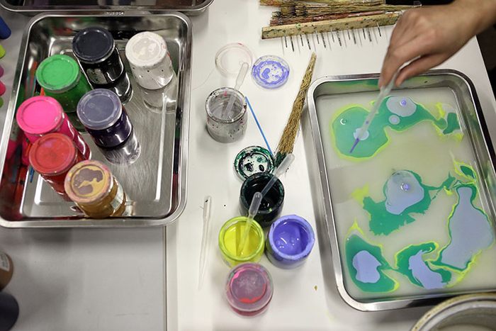 专家正在制作流沙笺纸。制作流沙笺纸需要用到颜料、吸管等工具。
