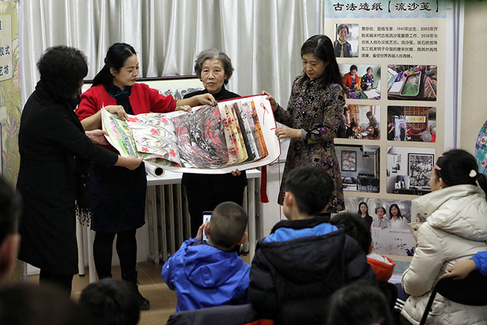新京报讯 1月29日,40位白纸坊街道小居民和家长,在街道纸文化博物馆体验古法流沙笺纸制作过程。流沙笺起源于唐朝,是唐宋时期达官贵人使用的笺纸。流沙笺纸通过丝绸之路流传到世界各国,最终却在中国失传了。造纸专家曹珍仪和她的团队通过翻阅史料,反复试验,复原了古法流沙笺纸的造纸技艺。活动中,曹珍仪向纸文化博物馆捐赠流沙笺纸成品,并向现场小朋友和家长传授流沙笺制作技艺。