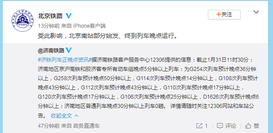 据济南铁路客户服务中心12306提供的信息:截止1月31日11时30分:济南地区京沪高铁和胶济客专所有动车组晚点5分钟以上列车:为G254次列车预计晚点36分钟以上,G258次列车预计晚点50分钟以上,G114次列车预计晚点14分钟以上,G108次列车预计晚点43分钟以上,G112次列车预计晚点43分钟以上,G110次列车预计晚点17分钟以上, G120次列车预计晚点17分钟以上,G106次列车预计晚点25分钟以上,D1626次列车预计晚点6分钟以上;济南地区普通列车晚点30分钟以上列车0趟。 详情请随时关注12306网站和车站公告。