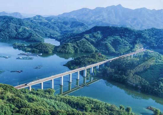 ▼贵广高铁幸福源水库大桥,摄影师@刘慎库
