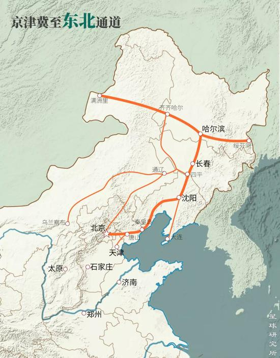 ▼京津冀-东北通道主要铁道线路,制图@张靖/星球研究所