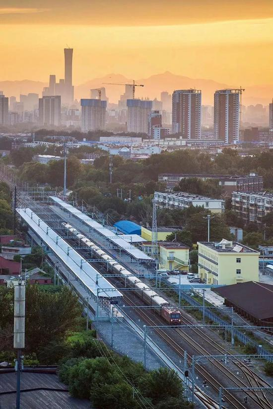 ▼京津城际铁路通过北京永定门附近,摄影师@焦潇翔